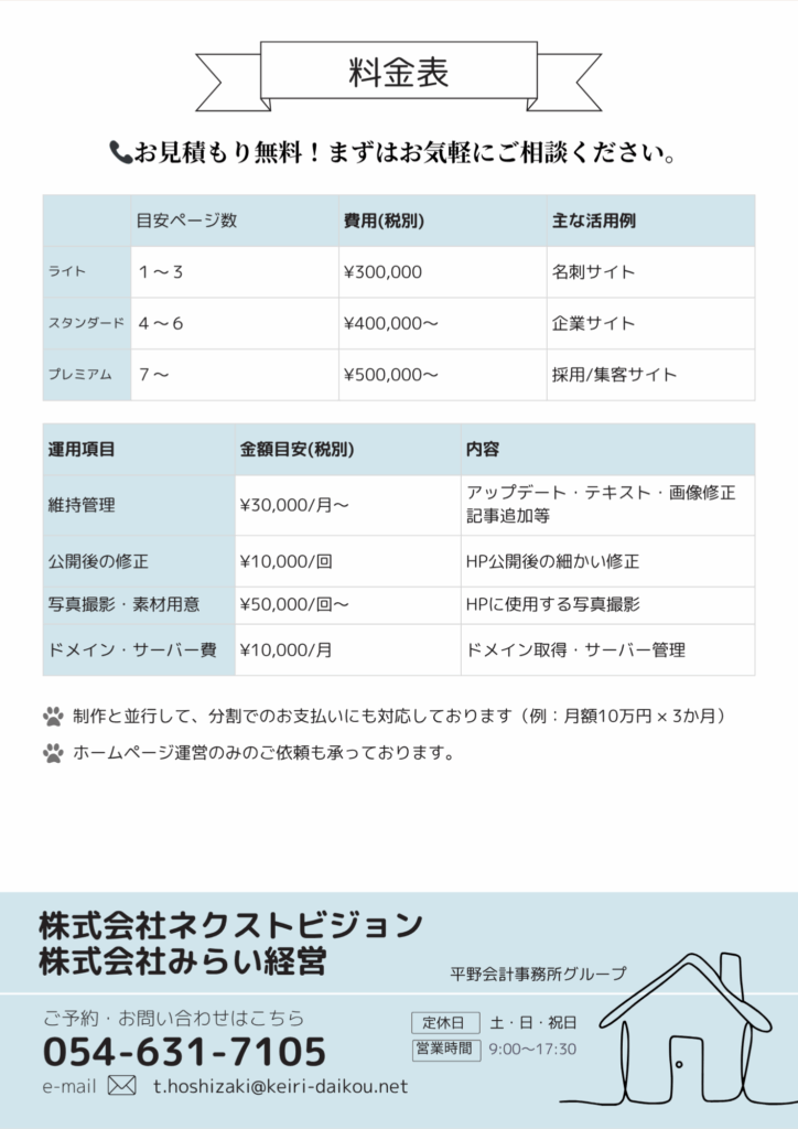 お客様から「どんなサービスがあるのか、料金体系が知りたい」といった声をいただくことが多く、これまで口頭で個別にご案内していましたが、よりわかりやすく、統一感のある形でお伝えできるよう、資料を整備いたしました。
