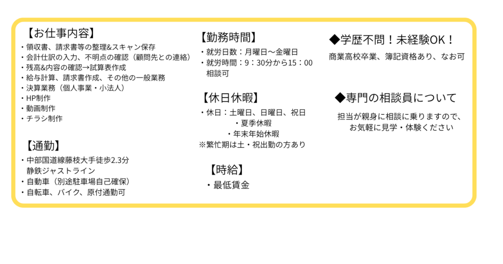 税理士事務所が近くにあることで、こんな特典が...会計に関するスキルについて、定期的に、現役の会計事務所職員からレクチャーを行い、簿記や会計に関するスキルを身につけてもらうことができます。実際に実務でつまづくことがあっても、やり方もしっかり教えますし、何より、ごく身近に実際にみなさんが働く会計事務所があるので、「就職したらどういうことをするのか?どういう感じで働くのか?職場のイメージは?」といった、実際の業務以外の部分もイメージすることができ、安心して働くことにつながります。